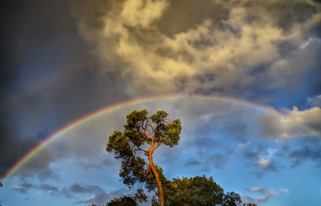 Double rainbow above a pine tree in the afternoon sun